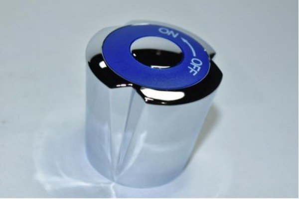 Chrome-plated plastic faucet handle with ON/OFF marking, designed for smooth operation, secure fitting, and durable performance in sanitary applications.