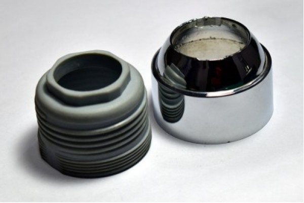 Precision-moulded plastic faucet valve housing with chrome-finished cap, designed for secure installation and durable performance.
